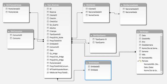 De modo a produzir este esquema, procedeu-se primeiramente à criação da tabela de factos Fact_Reservas, a partir de um conjunto de várias tabelas de consumos dos estabelecimentos da unidade e dos dados do relatório Rooming List. Em seguida, deu-se início à elaboração das tabelas de dimensão DimPontodeVenda, DimConsumos, DimCliente, DimNacionalidade, DimTipoQuarto, DimEntidade e DimTempo.