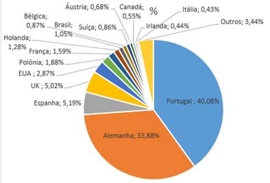 A Figura 3.10 revela uma maior predominância germânica (59,71% do total) do que na época alta (Figura 3.5), uma vez que setembro e outubro são dois dos meses mais frequentados por alemães (92,16% dos 3278 da figura 3.10 consumiram num destes meses), o que deixa Portugal muito abaixo em relação ao 1º quadrimestre (Figura 3.2) e época alta (Figura 3.5), com apenas 19,84%.