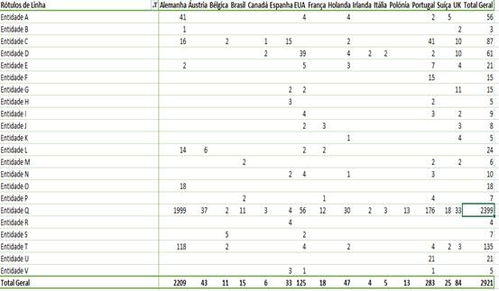 Em relação às nacionalidades, uma menção honrosa para os EUA, que acumula 4,28% do número total de hóspedes da Figura 3.3, sendo a 3ª nação mais destacada, apenas atrás da Alemanha (75,62%) e de Portugal (9,53%). Todavia, pode-se afirmar que, ainda que não estejam muitos operadores turísticos/agências dos EUA representados na figura (4 em 22), esta classificação deve-se à vinda de 76% de norte-americanos através da Entidade D e Entidade Q. Por outro lado, a Polónia é o único país da figura que recorreu a apenas 1 dos 22 operadores turísticos/agências.