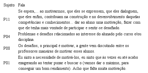 O desafio de motivar é demonstrado nas falas apresentadas no Quadro 1.