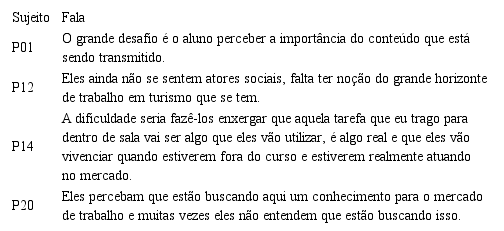 Motivar e fazer com que o aluno tenha consciência de que o que é visto em sala pode e deve ser associado ao mercado de trabalho, ao mesmo tempo, os docentes também relatam que o ensino do turismo não está conseguindo acompanhar o desenvolvimento e os anseios do mercado de trabalho, seja pela burocracia da instituição ou pela necessidade de adaptação e atualização de conteúdos e ementas.