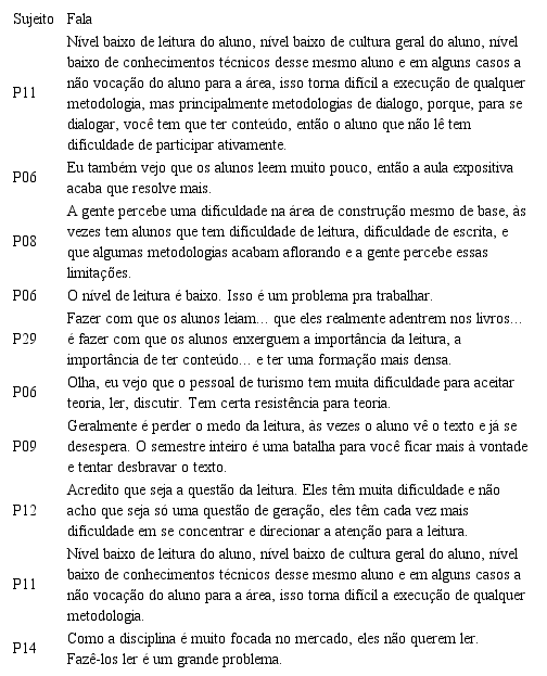 - Ainda foi mencionada pelos docentes como um fator que compromete na aplicação das metodologias de ensino a dificuldade da leitura por parte de alguns discentes;