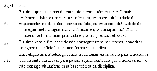 Outro aspecto apontado como uma dificuldade dos docentes que poderia impactar na aplicação de metodologias ativas no ensino de turismo diz respeito à composição da maioria do quadro de docentes do curso pertencer a diferentes áreas de conhecimento, que encaminham professores para ministrarem disciplinas de Turismo, uma vez que o curso demanda profissionais das mais diversas áreas de formação.