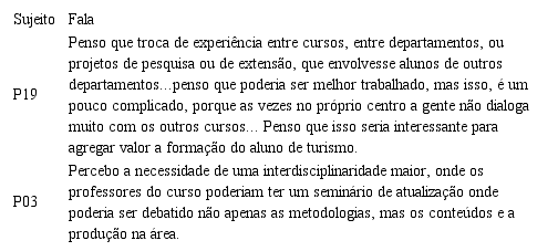 O Curso de Turismo é multidisciplinar e devido a essa característica conta com a participação de docentes dos mais diversos centros de ensino, e sem que haja uma interação entre esses centros, provavelmente não ocorrerá também com o corpo docente. E nesse sentido, sem uma interação que proporcione um melhor entendimento do que se esperar do curso, perdem-se oportunidades em projetos de pesquisa e extensão que poderiam ser desenvolvidos em conjunto, como também a possibilidade do desenvolvimento de novas competências para o discente, que teria a oportunidade de ter uma nova visão de curso, uma visão sistêmica relacionada aos demais cursos que fazem parte da estrutura curricular da graduação de turismo.