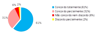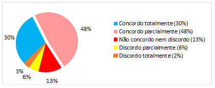 Como pode ser analisado na Figura 2, 78% afirmaram estar de acordo com a eficiência da visibilidade, da legibilidade e da segurança das placas de sinalização, sendo que a maioria, 48% do total, disse estar apenas parcialmente de acordo com essa assertiva. A minoria, que foi de 9%, posicionou-se negativamente a essa afirmação, e as pessoas que afirmaram indiferença foram 13% do total das entrevistas.