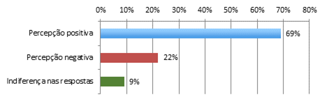 Vale ressaltar, ainda, que o nível de indiferença nas respostas às escalas estabelecidas pela pesquisa foi baixo (9%), o que revela que os entrevistados, em grande parte, procuraram expressar sua percepção (positiva ou negativa) sobre os aspectos investigados.