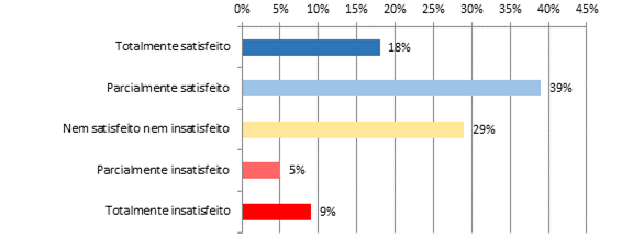 Neste ponto, foi levado em consideração o grau de satisfação dos viajantes, em âmbito geral, acerca da sinalização turística de Natal-RN. Portanto, a avaliação geral quanto à satisfação com a sinalização turística de Natal-RN é de que 57% do total de pessoas consideram-se satisfeitas, enquanto 14% manifestaram insatisfação com essa parte da infraestrutura turística da cidade, conforme apresentado na Figura 7.
