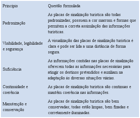 Vale ressaltar que essa dimensão da análise diz respeito a um aspecto estritamente técnico, que é a obediência da sinalização à normatização existente. Sobre esse aspecto, a percepção do viajante pode remeter-se ao que foi visto em outros destinos turísticos ou a uma impressão imediata, que não necessariamente diz respeito ao conhecimento dos aspectos normativos envolvidos.