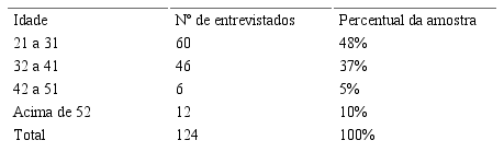 Por meio das respostas obtidas com a aplicação dos 124 questionários, verificou-se que a maioria dos respondentes (56%) é do sexo masculino e 44%, do sexo feminino. A Tabela 2 apresenta a distribuição da amostra por faixa etária.