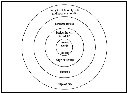 These influences of location on hospitality are understood with reference to Egan and Nield (2000), through the identification of hierarchies of hotels according to their installation points around the cities where, according to the authors, the most luxurious hotels are located in the centers of the cities, with the accommodation hierarchy decreasing as the circle widens (figure 1).