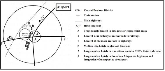 Asworth and Haan (1985), cited in Pearce (2003, p.314), detail hotel distribution in a general context, while observing its specialty for historical-tourist cities which, even so it is worth the emphasis, characterizing and pointing to the center of the map the historical center of the city and its central business district (CBD).