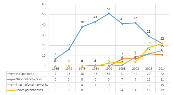 Curitiba has also received network hotels from the state of Paraná (using the city as a base) and national and international networks, as well as the independent hotels i.e. those that are not part of any chain. The evolution of these hotels during the study period is shown in the figure below: