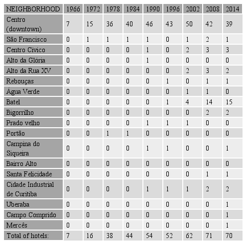 Table 1 considers some historical moments in Curitiba and shows a doubling of the number of hotels between 1966 and 1972 (installation of the Industrial City of Curitiba). There were a total of 54 hotels in 1990, the same number in 1996, and a small decrease of 2 hotels (a period when car manufacturers and multinational corporations arrived in Curitiba and the metropolitan region).