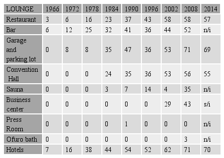 Another issue that was analyzed in the hotel industry is the evolution in the provision of lounges for guests, complementing its lodging experience and transforming the hotel from a place to rest and stay overnight to a space for dining, and social interaction with other guests and/or other visitors, as well as business and event areas, as observed in Tables 2 and 3 below.