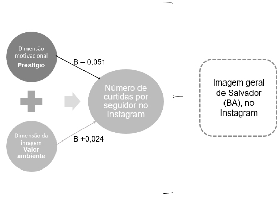 O resultado reforça a importância da dimensão valor/ambiente e da dimensão prestígio nas imagens, haja visto que, entre as dimensões, foram as únicas que significativamente influenciam na quantidade de curtidas por seguidor. Os gestores devem procurar imagens que agreguem valor ao ambiente para atrair turistas para Salvador (BA). O resultado da dimensão prestígio corrobora com a pesquisa de Baloglu e McCleary (1999) quanto à influência significativa desta dimensão na formação da imagem, entretanto, no caso de Salvador (BA), a influência é negativa.