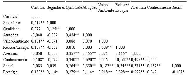 Para as discussões e a apresentação dos resultados, serão apresentadas inicialmente as correlações entre as variáveis, depois serão apresentados os resultados do modelo proposto nesta pesquisa e, por último, serão discutidas quais dimensões da imagem do destino turístico Salvador (BA) tendem a receber mais curtidas no Instagram.