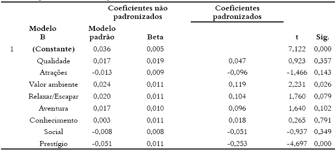 A partir da análise da Tabela 02, nota-se que, das oito variáveis lançadas como independentes, apenas duas permaneceram na análise compondo o modelo final. A imagem geral do destino turístico Salvador (BA) é explicada pela seguinte modelo.