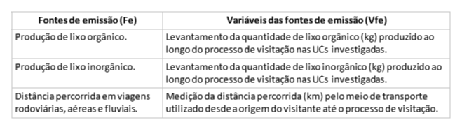 Para esta investigação, em função de seus objetivos, foram selecionadas as categorias produção de lixo orgânico e inorgânico, e os gastos com combustíveis nas viagens rodoviárias e aquáticas, assim o Quadro 1 apresenta a descrição das fontes de emissão e de suas respectivas variáveis para fundamentar o referido processo de inventariação.