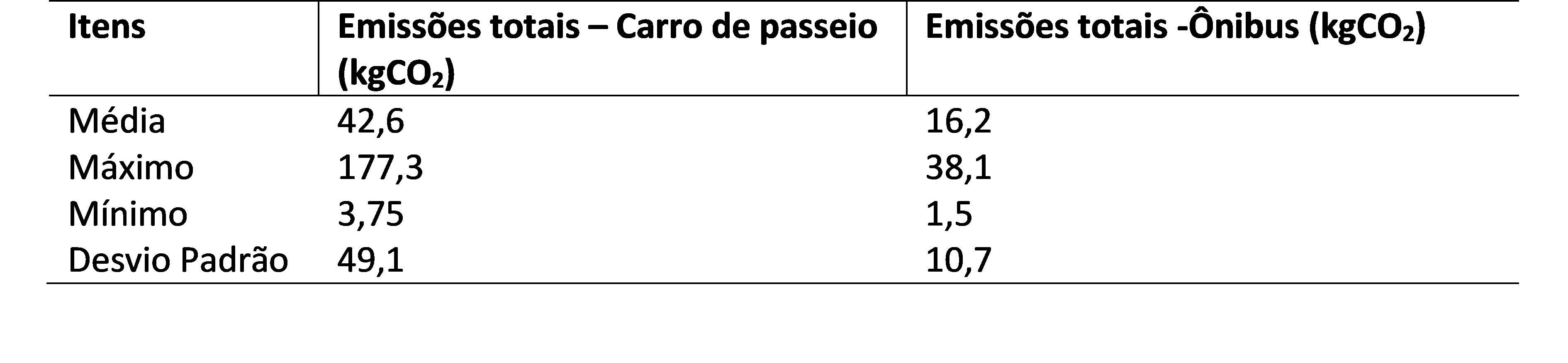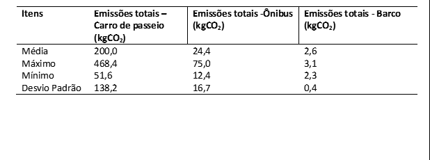 Com base nas Tabelas 1 e 2, notou-se a significante participação do carro de passeio nas emissões de CO2 nas UCs APA do Delta do Parnaíba e PARNA de Sete Cidades, na medida em que a média na primeira UC foi de 200 kgCO2 por viagem, enquanto a média do itinerário de ônibus foi de 24,4 kgCO2 e a de barco foi de 2,6 kgCO2. Na segunda UC, a média de emissões do carro de passeio foi de 42,6 kgCO2 por viagem e a de ônibus foi de 16,2 kgCO2 por viagem. Em ambas as UCs, o combustível utilizado pelos carros foi gasolina e pelos ônibus o diesel.