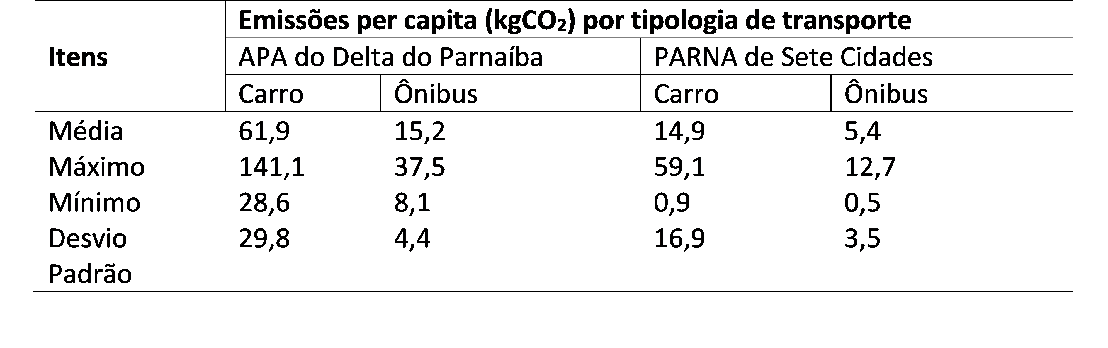 Alicerçando-se na Tabela 3, registrou-se mais uma vez a importância do modal carro de passeio nas emissões de transportes das UCs, uma vez que na APA do Delta do Parnaíba a média foi de 61,9 kgCO2 per capita, bem acima da média de 15,2 kgCO2 per capita na tipologia ônibus; e no PARNA de Sete Cidades foi de 14,9 kgCO2 e de 5,4 kgCO2, respectivamente.