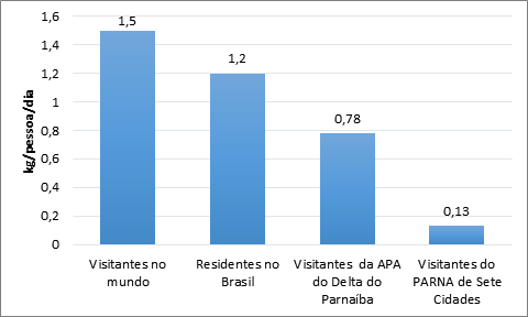 Para ilustrar essa interpretação, apresenta-se a média de produção de lixo gerada por hora com base nos dados supracitados, assim se observou que a produção de lixo per capita em um período de tempo de uma hora era maior na APA do Delta do Parnaíba, com 111gramas/hora, situando-se, assim, acima da média de geração de lixo dos visitantes no mundo e dos residentes no Brasil, com 62,5 gramas/hora e 50 gramas/hora, respectivamente. Já no PARNA de Sete Cidades, a média foi expressivamente menor em comparação com os demais. Tal realidade demonstrou que em sete horas de passeio na APA do Delta do Parnaíba, os visitantes geravam 65% da média de lixo dos residentes no Brasil, cuja média era de 1,2 kg/dia, segundo a Associação Brasileira das Empresas de Limpeza Pública e Resíduos Especiais (ABRELPE, 2013).