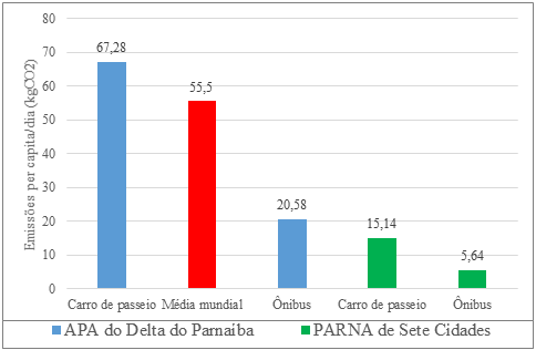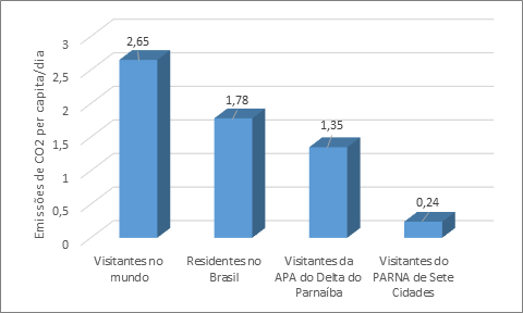 Considerando as emissões totais dos visitantes das UCs, observou-se que os visitantes da APA do Delta do Parnaíba, com o transporte carro, emitiram CO2 acima da média mundial de emissões turísticas/per capita, diferentemente dos usuários dessa categoria no PARNA de Sete Cidades e da tipologia ônibus em ambas UCs, que emitiram valores abaixo da média mundial, em razão do menor consumo de combustível do transporte coletivo/por pessoa e da menor distância percorrida no carro de passeio da origem dos visitantes até a UC.