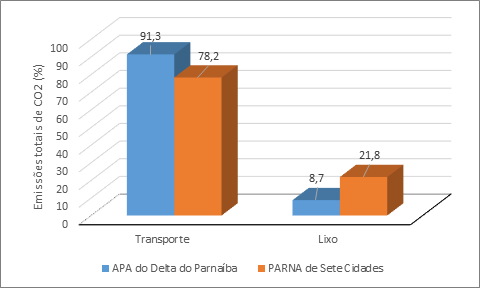 No que concerne ao inventário das emissões de CO2, constatou-se que os principais impactos na visitação às UCs derivaram do consumo de combustíveis fósseis, como a gasolina e o diesel, no deslocamento e na visita às UCs, pois os visitantes adotaram o carro de passeio e o ônibus como principais meios de transporte, assim a categoria transporte respondeu por 91,3% das emissões totais na APA do Delta do Parnaíba e por 78,2 no PARNA de Sete Cidades. Já a produção de lixo orgânico e inorgânico equivaleu a 8,1% e 21,8, respectivamente.