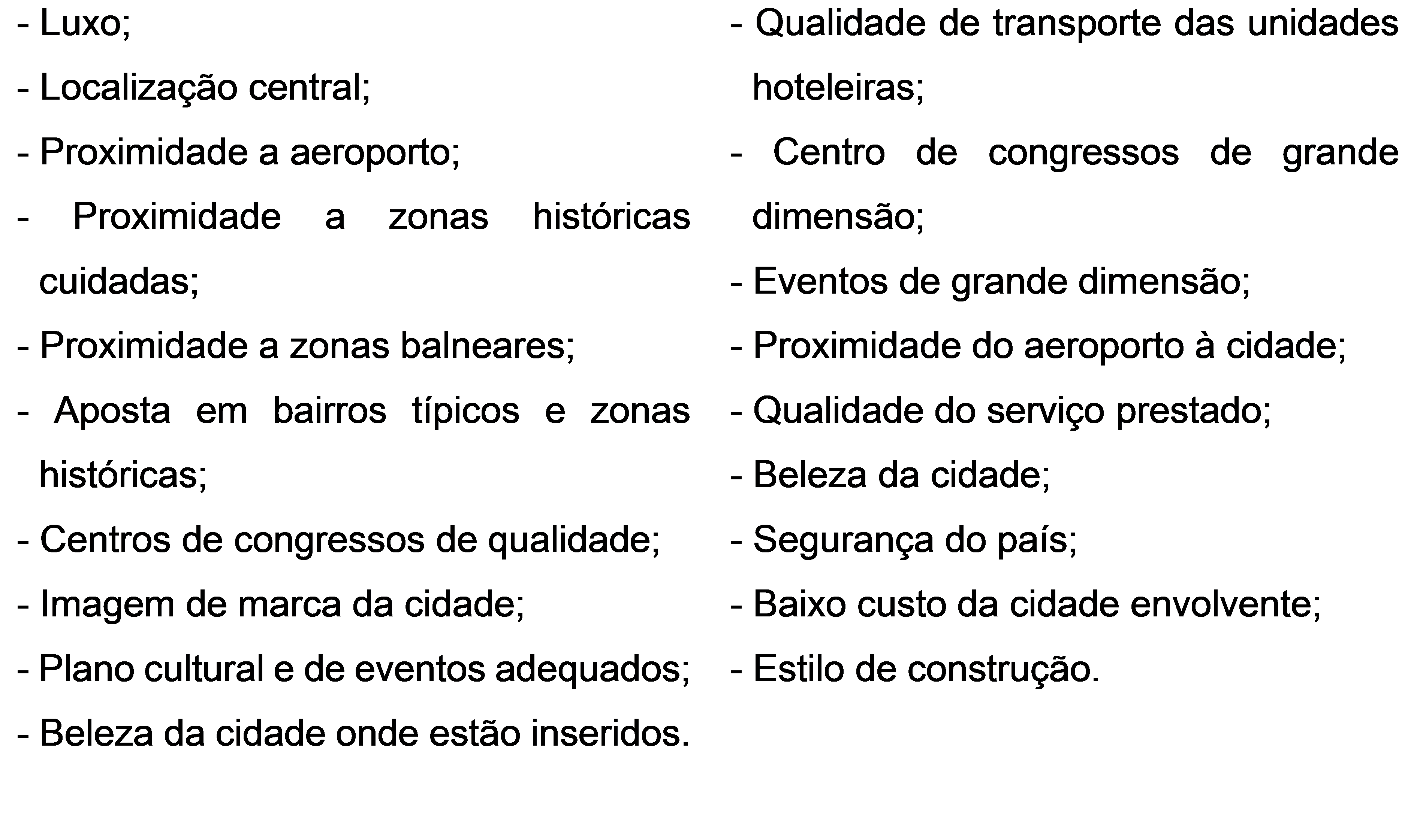 Num estudo efetuado para a cidade de Lisboa, Everard (2010) apresenta as externalidades positivas (Quadro 1) e negativas (Quadro 2) para os hotéis de luxo, obtidas por meio de entrevista.