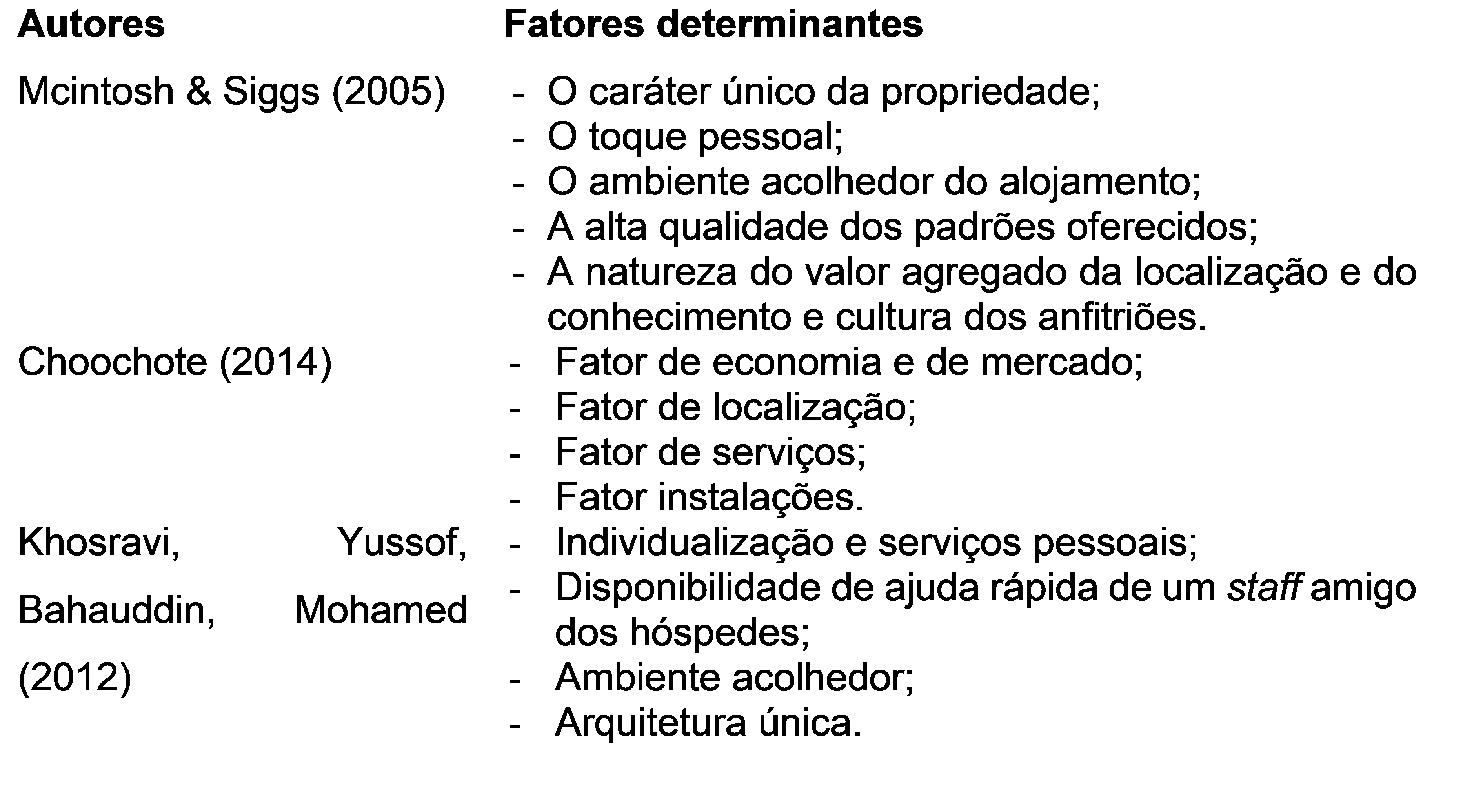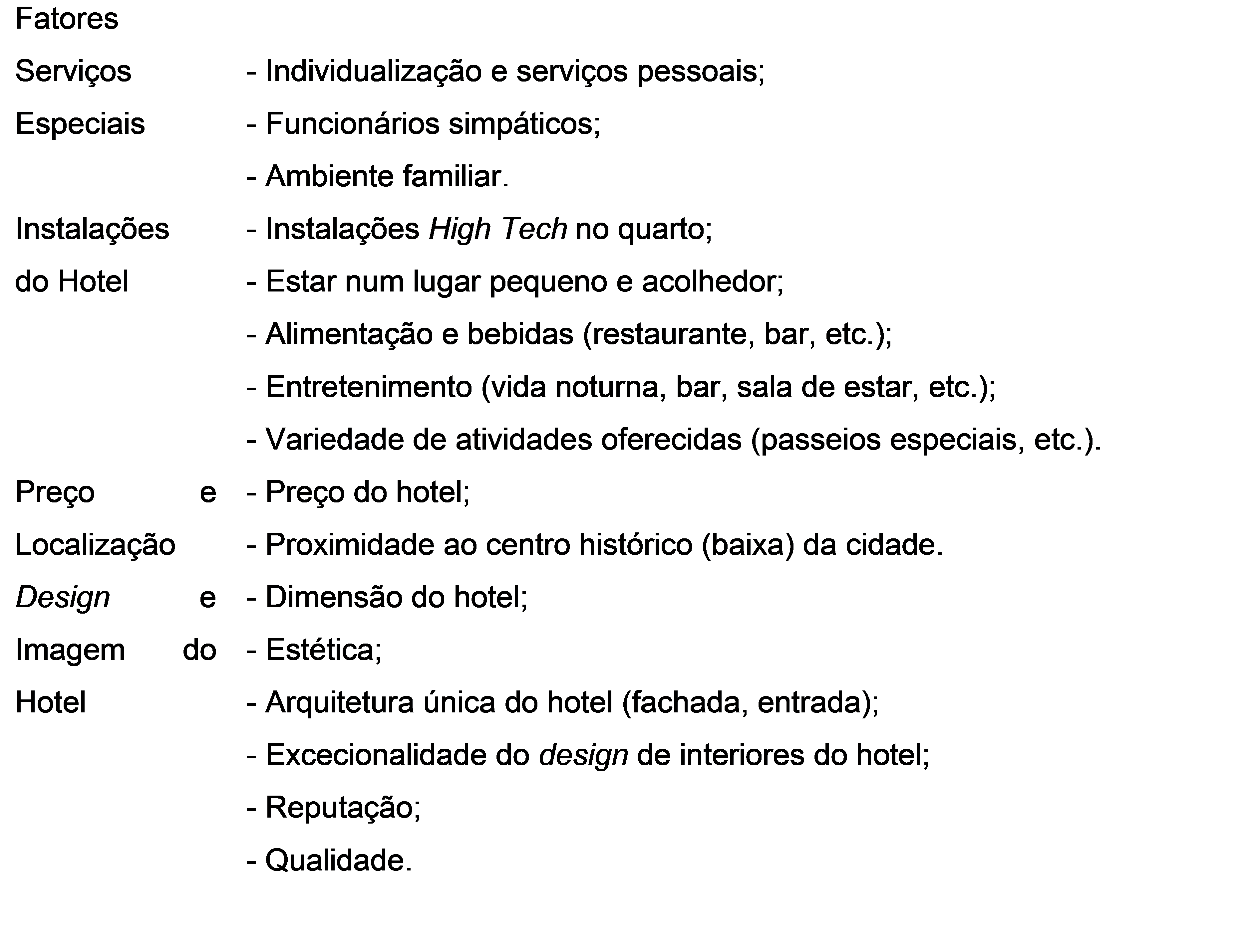 Choochote (2014) observou quatro fatores na seleção de hotéis boutique pelos turistas: a) fator de economia e de mercado; b) fator de localização; c) fator de serviços; e d) fator instalações.