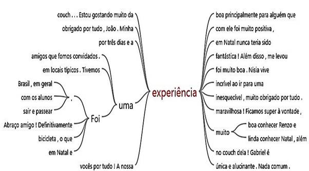 Dentre as palavras que foram mensuradas para formarem a nuvem, o enfoque maior foi “experiência”, por acreditar que ela é chave para entender as relações entre os anfitriões e os hóspedes. Assim, foi realizada uma segunda análise de dados, buscando relacionar as experiências e os relatos dos surfers[4]. O resultado gerou uma árvore de palavras realizada por meio do Nvivo. As ramificações existentes contêm partes dos comentários que foram coletados. Tais comentários enaltecem as experiências obtidas pelos viajantes.