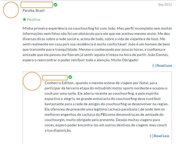 Por meio do conteúdo gerado pelo usuário e com base nos dados dessa pesquisa, os usuários que pretendem se hospedar e utilizarão a comunidade para encontrar anfitriões na cidade de Natal/RN terão confiabilidade ao ler os comentários escritos nos perfis dos usuários. Mesmos realizando uma análise da palavra “recomendo” e ela aparecendo apenas 06 (seis vezes) dentre os 73 comentários analisados, é nítido nos comentários o grau de satisfação dos hóspedes em relatar suas experiências e também nas recomendações feitas: “[...] conversamos sobre vários assuntos. Recomendo o couchsurfing”. “Ela é uma mulher muito autêntica, querida e parecida comigo! É divertida! Recomendo”. “Recomendo a todos do CS”. “Totalmente recomendável”. No caso a seguir, além da mensagem postada pelo usuário, ainda é respondido pelo anfitrião que o acolheu durante o seu tempo de permanência na cidade.