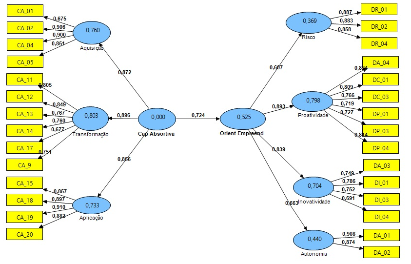 Observou-se que a capacidade absortiva gera efeito significativo sobre orientação empreendedora, ou seja, 52% da variação da orientação empreendedora é determinado pela influência da capacidade absortiva. A Figura 1 a seguir apresenta-se o modelo de relacionamentos testado.