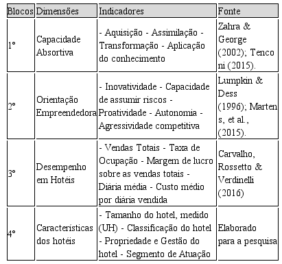 O instrumento usado na coleta passou por um processo de validação textual feito por especialistas acadêmicos, e por um pré-teste realizado com quatro gestores de hotéis não pertencentes à população do estudo, nas cidades de São José (SC), Blumenau (SC) e Bombinhas (SC). Os quatro blocos utilizados na pesquisa com a descrição das variáveis e indicadores podem ser visualizados no Quadro 1.