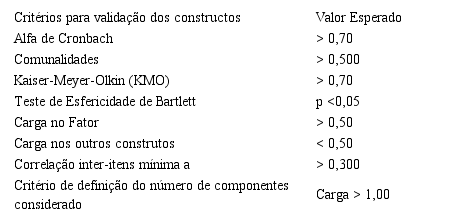 A validação das escalas para uso no setor hoteleiro foi realizada com o auxílio de análise fatorial. Para tanto, adotaram-se os critérios apresentados no Quadro 2, para verificação da validade e adequação dos constructos de capacidade absortiva e orientação empreendedora, a partir da Análise Fatorial Exploratória (AFE). Após a validação dos construtos, procedeu-se a análise do relacionamento entre eles, sendo utilizada a Modelagem de Equações Estruturais através da técnica dos Mínimos Quadrados Parciais com a utilização do software Smart PLS. No quadro 2 apresenta uma síntese dos critérios a serem utilizados para se avaliar a adequação dos constructos de mensuração, a partir das análises fatoriais realizadas.