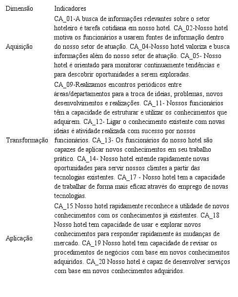 O instrumento de coleta de dados foi constituído por escalas do tipo Likert de sete pontos, as quais mensuraram a capacidade absortiva dos hotéis pesquisados, segundo as dimensões propostas por Zahra & George (2002), baseadas no trabalho desenvolvido por Tenconi (2015), composto de 20 afirmativas.