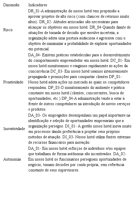 Para mensurar a Orientação Empreendedora foi utilizada escala desenvolvida por Martens, et al. (2015) e adaptada para o setor hoteleiro, composto por 20 afirmativas divididas entre as dimensões de Inovatividade, Assumir Riscos, Proatividade, Autonomia e Agressividade Competitiva, propostas por Lumpkin & Dess (1996).