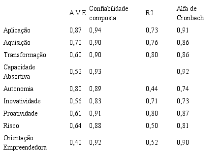 A análise da relação entre capacidade absortiva e orientação empreendedora foi realizada através de modelagem de equações estruturais, utilizando-se a técnica dos Mínimos Quadrados Parciais - PLS, iniciando-se com a análise do modelo de mensuração, procederam-se os testes de confiabilidade composta (C.R.), Variância Média Extraída (AVE) e Alfa de Cronbach. A análise estrutural deu-se pela avaliação do coeficiente de determinação (R2) e da significância do caminho entre ACAP e OE medida pelo teste t. A Tabela 1 a seguir mostra os índices de confiabilidade do modelo de mensuração