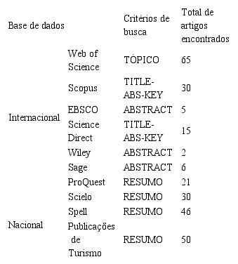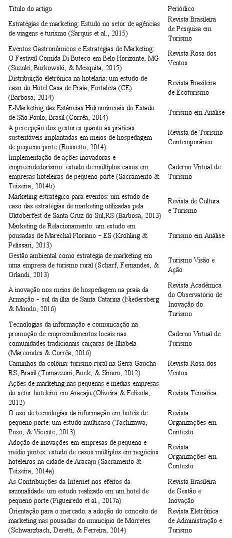 Embora o buscador “Publicações de Turismo” não seja uma base ideal de busca, haja vista a desatualização da página desde 2015, recorreu-se a ela de forma a complementar os achados nas bases Scielo e Spell. Nessa base, que disponibiliza artigos de periódicos científicos de turismo, empregou-se somente o termo “marketing” no buscador, por motivos idênticos aos descritos anteriormente. Ao se inserir termos relativos ao porte das organizações na busca, poucos artigos eram encontrados. Dessa forma, optou-se incluir todos os artigos encontrados na busca, postergando-se a decisão de incluir ou não o artigo nas análises do presente estudo para a etapa de leitura dos resumos.