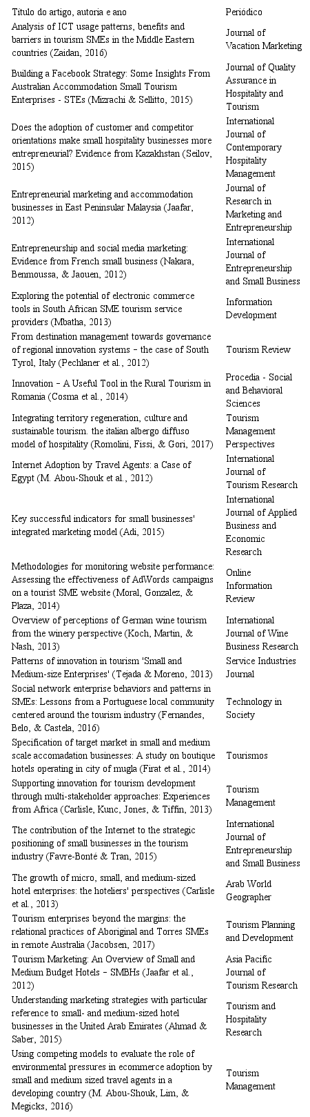 Nas bases Scielo e Spell foram empregados somente os termos “marketing” e “turismo”, considerando o pequeno volume de artigos encontrados quando se empregava as estratégias descritas acima. Ou seja, quando se combinava na busca termos referentes ao porte das organizações, tais como “pequenas e médias empresas”, “pequeno porte”, “PME” e seus derivados, o quantitativo encontrado era pequeno. Optou-se, dessa forma, por incluir todos os artigos encontrados na busca sem levar em consideração, nessa etapa, o porte das organizações.