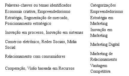 Constatou-se a existência de correspondência categórica entre as teorias utilizadas pelos estudos e a área econômica do turismo abordada por eles. As empresas relacionadas às atividades recreativas, culturais e desportivas do turismo foram associadas à temática do Marketing de Relacionamento. Os meios de hospedagem foram associados às temáticas do Empreendedorismo e do Marketing Digital. Os estudos relacionados à indústria do turismo foram associados às temáticas de Inovação em Marketing e Vantagem Competitiva. Por fim, as agências de viagens e as empresas relacionadas ao ramo de alimentação foram associadas à temática da Estratégia em Marketing.