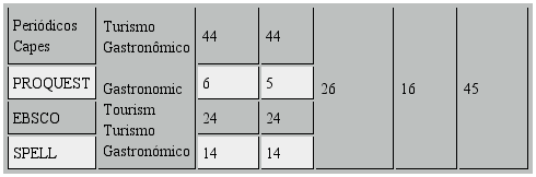 A consulta foi realizada nas bases de dados: periódicos CAPES, SPELL, PROQUEST, EBSCO. Como descritores-chave foram utilizados: turismo gastronômico, gastronomic tourism e turismo gastronómico. Desta maneira, objetivou-se agregar artigos de idiomas: português, inglês e espanhol. Como filtro inicial foram considerados os descritos de diferentes maneiras, em conformidade com as limitações/opções de cada base, ou seja: a) periódicos CAPES: a busca considerou o título das pesquisas; b) PROQUEST: foram considerados os trabalhos com base na associação dos descritos com o resumo dos trabalhos e publicações revisadas por especialistas; c) EBSCO: foram selecionados os artigos com base no resumo, textos completos e revistas acadêmicas; e; d) SPELL: considerou-se os resumos dos trabalhos.