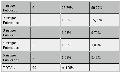 Na sequência realizou-se a comparação do número de trabalhos publicados em função da lei de Lotka. A lógica deste padrão ensina que o percentual de pesquisadores que publica apenas 1 trabalho, em determinada área, corresponde a 60,79%. A partir deste indicador outros, na sequência, são assumidos considerando a regra matemática do quadrado inverso. Todos os indicadores são apresentados no Quadro 2, considerando-se autores e co-autores. Diante dos resultados verifica-se que o percentual de autores que publicam apenas 1 artigo supera em 35% o que foi definido como o padrão deste quantitativo de produção. Ressalta-se que o padrão de Lotka apresentou superavitário em todos os indicadores.