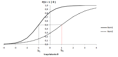A relação existente entre P(Uij = 1| θj) e os parâmetros dos itens do modelo logístico de dois parâmetros (ML2) da Equação (1) é mostrada na Figura 1, que é chamada de Curva Característica do Item (CCI). Para exemplificar, demonstram-se dois itens hipotéticos: