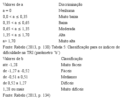 Para uma avaliação consistente dos itens, deve-se ter em mente a classificação dos parâmetros discriminação ‘a’ e dificuldade ‘b’ (Rabelo, 2013).