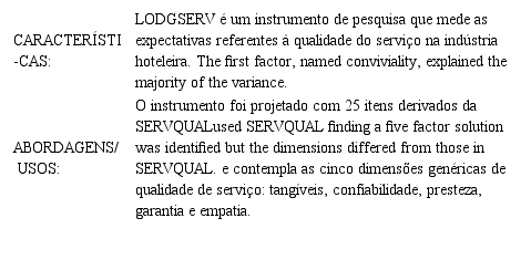 De acordo com Limberger et al. (2016), os modelos LODGSERV; o HOTELSERV e o HOTELQUAL são todos modelos de adaptações do SERVQUAL criados especialmente para a indústria hoteleira, demonstrando que não há muita diferenciação entre os modelos, pois as perguntas não contêm grande variação e utiliza-se a diferença entre qualidade percebida e expectativa para avaliar a qualidade geral.