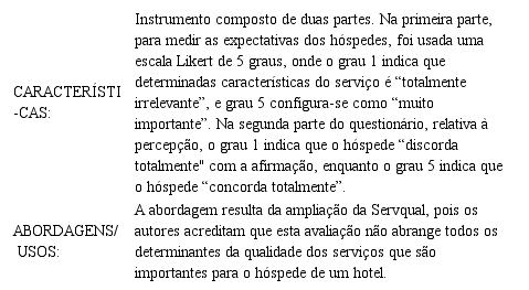 Ressalta-se que o formulário a ser apresentado adiante, na Tabela 3, é proveniente de rotinas de avaliação de duas grandes redes de hotelaria internacional presentes no Brasil, ou seja, são instrumentos já utilizados na prática. Este formulário foi concebido utilizando o recorte teórico proveniente do modelo SERVPERF, de Cronin e Taylor (1992), uma vez que a medição da qualidade é realizada diretamente pela percepção dos fatos ocorridos sem envolver expectativas (LEE & KIM, 2014).