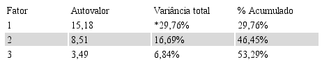 Foi utilizado o software R (CORE TEAM) na análise da confiabilidade e encontrou-se um Alfa de Cronbach de 0,91 quando considerados os 51 itens do instrumento. O valor obtido indica que o instrumento elaborado apresenta excelente consistência interna. Os valores adotados como referência para alfa são: acima de 0,90, é considerado excelente; entre 0,80 e abaixo de 0,90, é considerado bom; entre 0,70 e abaixo de 0,80, é considerado razoável; entre 0,60 e abaixo de 0,70, fraco; e abaixo de 0,60, inaceitável (HILL & HILL, 2000).