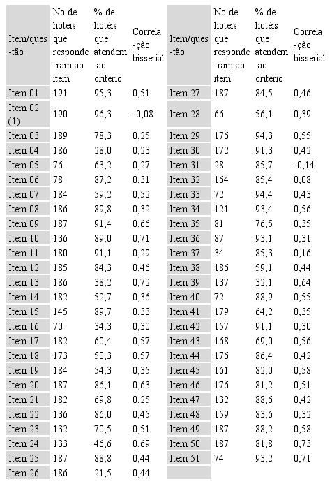Nesta etapa são observadas as frequências de respostas e a correlação bisserial para cada item, ou seja, como é medida a correlação de um item em particular do teste com o resultado do teste na íntegra. Bons itens são aqueles com correlação bisserial alta, apresentando boa discriminação (Ribeiro & Soares, 2008), ou seja, têm a propriedade de diferenciar hotéis nos níveis de qualidade em serviços. Por outro lado, itens com correlação bisserial negativa são indicativo que hotéis com escores mais altos de qualidade em serviços não estão atendendo ao critério examinado naquele item. Isto sugere um possível problema com o item, e assim deverá ser eliminado.