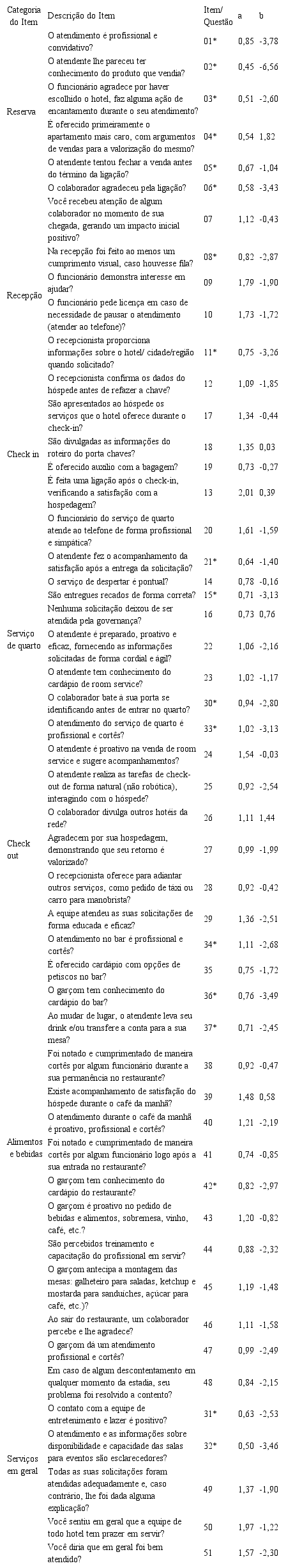 Considerando-se os critérios anteriores, 18 itens foram excluídos e com os 33 itens remanescentes, uma segunda calibração foi realizada. Importante ressaltar que o modelo matemático descarta os itens porque: (1) estes não conseguem medir, ou seja, conferir dificuldade ou facilidade; (2) por ter um erro elevado; ou (3) por ser extremante fácil, sendo contemplado por praticamente todos; ou extremamente difícil, em que quase nenhum hotel contemple.