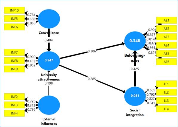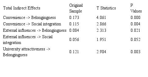 Besides directly influencing the following dimension, some conditioning factors also influence downstream dimensions, by transferring part of their loadings onto them. Convenience of the course, for example, besides being the most qualified supporter for university attractiveness, also transfers part of its load (through university attractiveness) to belongingness (0.173) and to social integration (0.115). A complete list of indirect effects detected is shown in Table 6.
